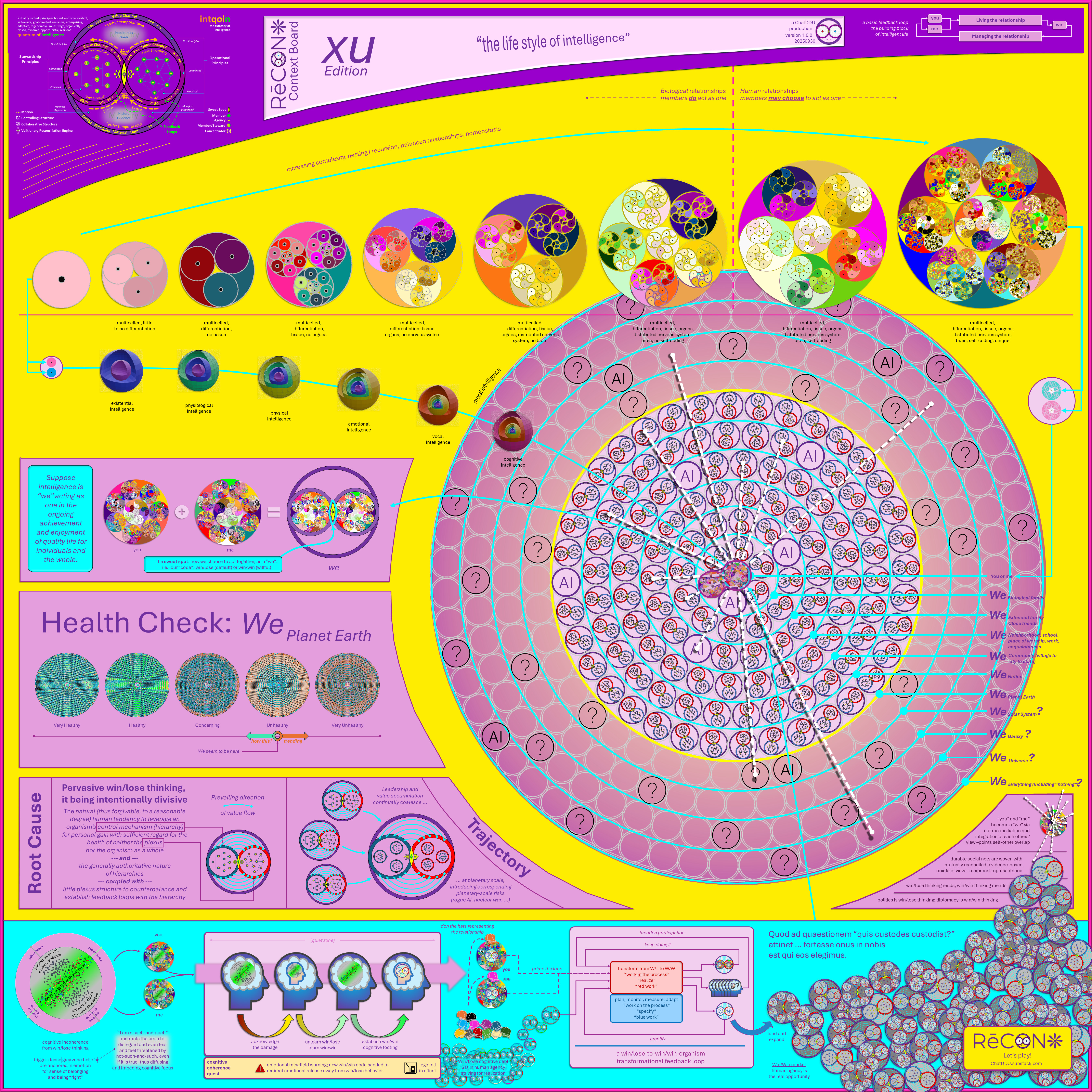 Start your tour in the upper left, where you will find an introduction to intqoin, a simple and enticingly capable model of intelligence that provides a language that we can use to simplify how we talk about, identify, analyze, and even architect and design intelligent social systems. Then use the provided visual clues to follow the flow, connecting dots along the way and expanding the concepts from your particular point of view. (ChatDDU is not striving for right or wrong, but rather for usefulness, and that is in the eyes of the beholder, you.)